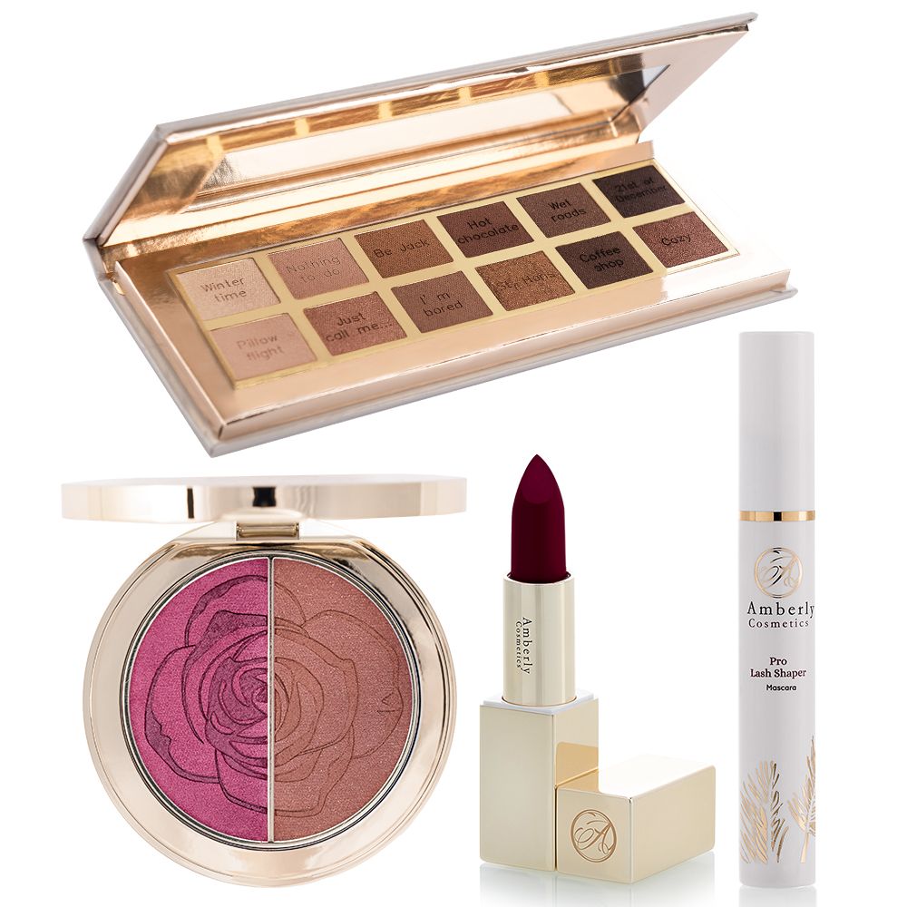 Lysreflekterende blush og solpudder, taupe øyenskygge-palett, fuktgivende leppestift og en sort mascara